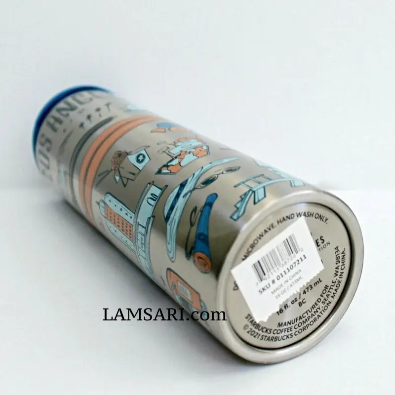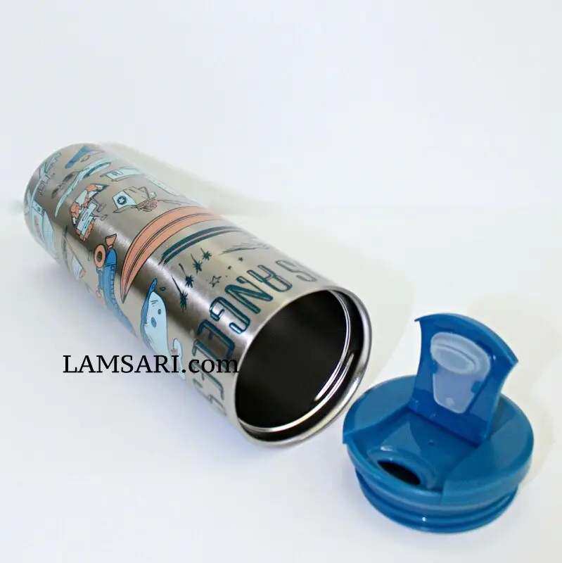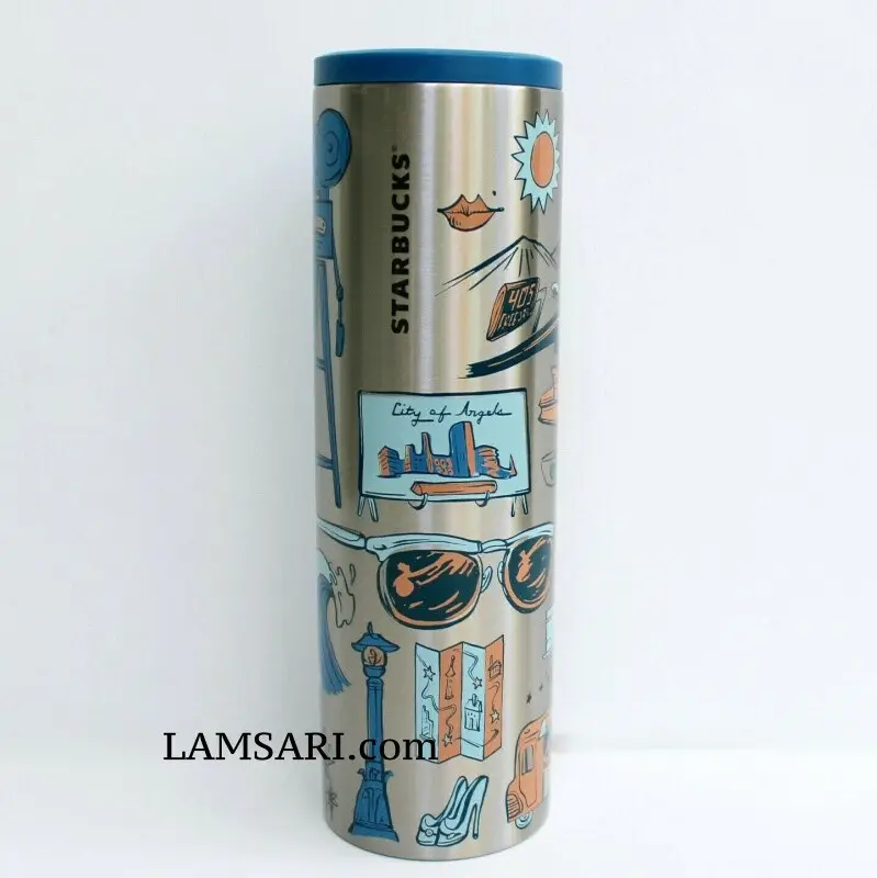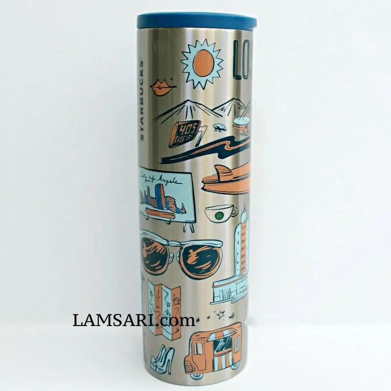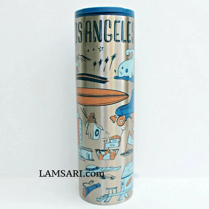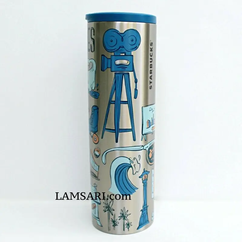 Art on tumbler highlights the fun life on the beach, the ocean, Hollywood film industry, the sun and other characteristics of Los Angeles metro area.