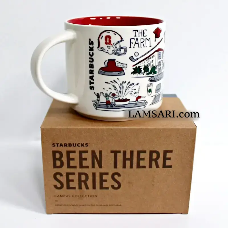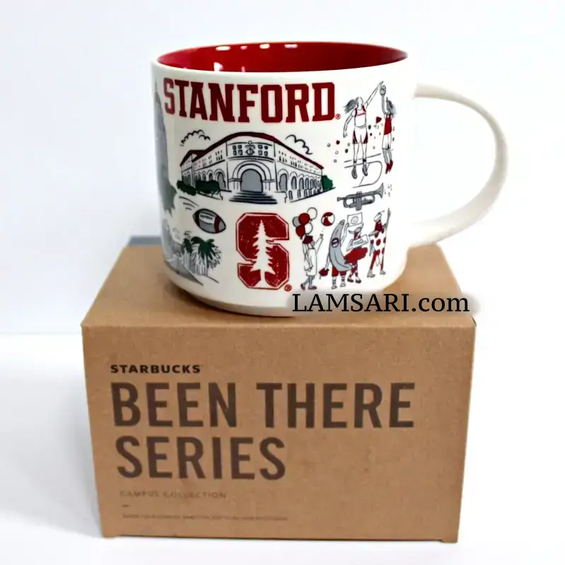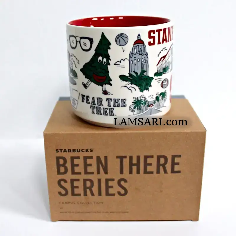Art on mug features Stanford University campus, Hoover Tower and Institution, other areas around Stanford campus, various sports activities including football and basketball, text ‘Fear The Tree” and others highlighting campus and student activities.